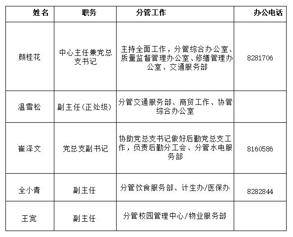 PA电子现设综合办公室、计生医保办、质量监督管理办公室、修缮管理办公室、校园管理中心/物业服务部、水电服务部、饮食服务部、交通服务部、医务所。